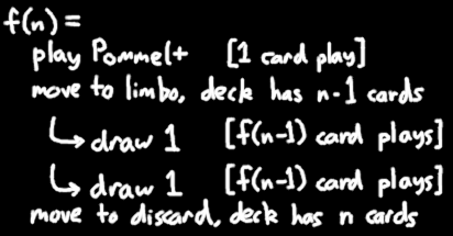 How do we compute f(n) without a specific value for n? Well, imagine you draw a Pommel Strike+. It immediately moves to limbo, and then it stays there forever until its entire chain of effects is done resolving. So for this entire duration, your deck effectively contains n-1 copies of Pommel Strike+.