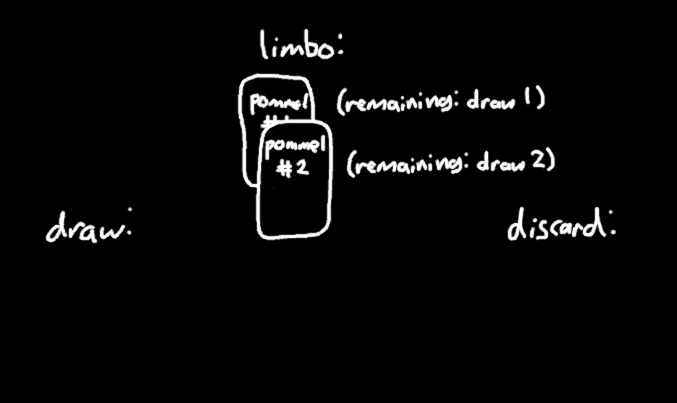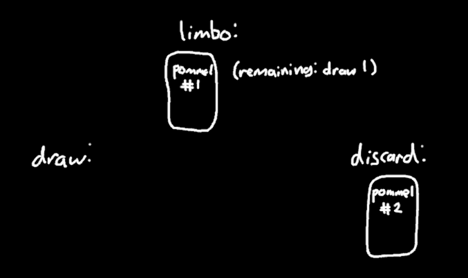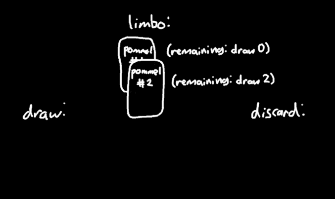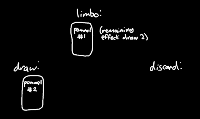 So what if you have two copies of Pommel Strike+? Let's say you have Hellraiser in play and you draw one of them. It moves to limbo, and then begins to resolve its "draw 2" effect.