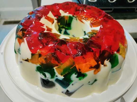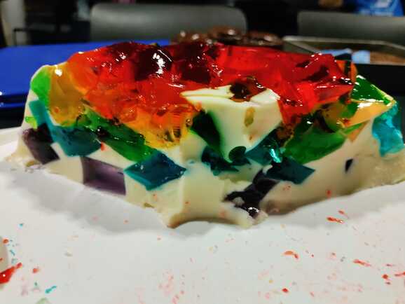 Since I was leaving for Thanksgiving the same day as the dance, I made this the previous day by walking down the baking aisle and grabbing random boxes (lemon cake mix and blueberry Jello powder, which as it turns out combine to be strikingly green).